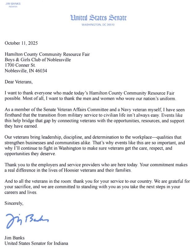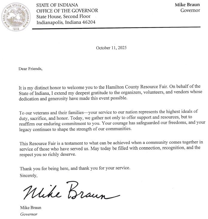 Last year, July 8, 2023, Oh what a day this was for Hamilton County!! We had around 250 guests throughout the day who came to get answers to their questions and issues and they were not disappointed. Our 55 resource vendors took care of their needs, answered their questions and assisted them in every way possible. We helped with housing, financial, insurance issues as well as introducing them to many other resources they didn’t know they were able to receive. Jill Fewell from Welcome Home Vietnam Veterans and the DAR presented 28 free gifts of “A Time To Honor” to our Vietnam Veterans, Gary Lawrence from the Indy Honor Flight was able to enroll 25 more Veterans to go to DC to see their Memorials and the Roudebush VA Hospital was able to file 65 new benefit claims as well as enroll many more into the VA system!! We thank our resources for their efforts to make this such a special day and we thank our guests who came to get their questions answered. And we thank our special guests who came to welcome our Military Veteran community, Congresswoman Victoria Spartz, Hamilton County Commissioner Mark Heirbrandt, Noblesville Mayor Chris Jensen, Brig Gen (Ret) Stewart Goodwin and Senator Youngs Regional Director Monica Bowles Kozlowski. Senator Braun couldn’t make it but he did write us a letter you can see below. So,,,, Yes, it was a great day for Hamilton County and we will do this again on July 13, 2024, same location. See y’all there!!